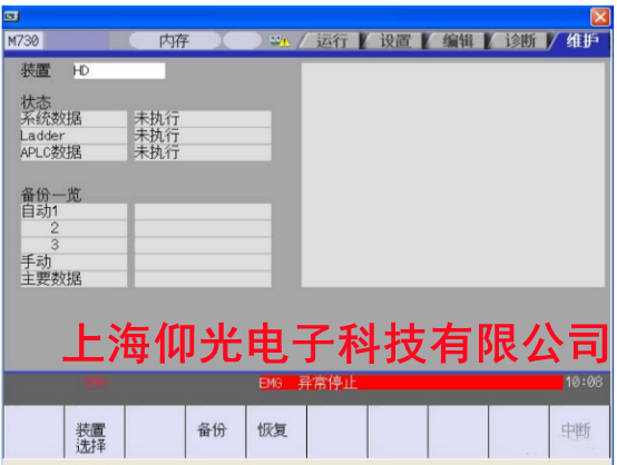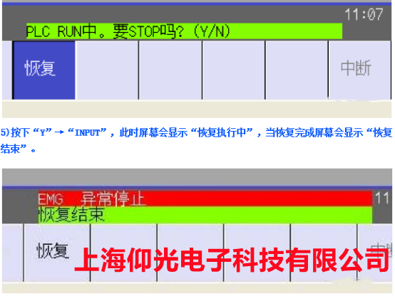 4.選擇完裝置后,按下“恢復”→“INPUT”→“Y”,此時屏幕顯示“PLC RUN。要 STOP 嗎?(Y/N)”