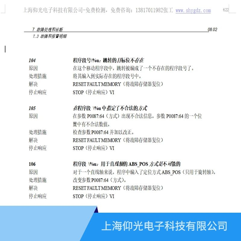 故障原因:對于 SET_O 或者 RESET_O 指令,在參數 P0086:64(指令參數)中輸入了不合法的數值。