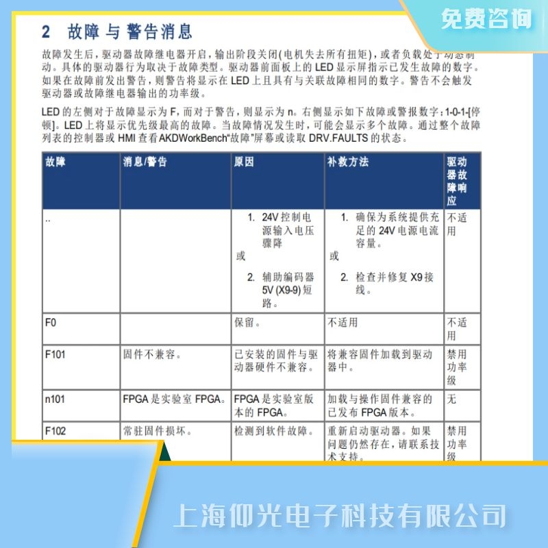 科爾摩根AKD系列伺服驅動器維修/伺服放大器維修/伺服控制器維修故障代碼和警告信息:F101,F102,F103,F104,F105,F106,F120,F121,F123,F124,F125,F126,F127,F128,F129,F130,F131,F132,F133,F134,F134,F135,F136,F139,F201,F202,F203,F204,F205-F232,F234,F237,F240,F243,F249,F250,F251,F252,F253,F256,F257,F301,F302,F303,F304,F305,F306,F307,F308,F312,F314,F401,F402,F403,F404,F405,F406,F407,F408-F416,F417,F418,F419,F420,F421,F423,F438,F439,F450,F451,F452,F453,F454,F456,F457,F458,F459,F460,F461,F462,F463,F464,F465,F467,F469,F470,F471,F473,F475,F476,F478,F479,F480,F481,F482,F483,F484,F485,F486,F487,F489,F490,F491,F492,F493,F501,F502,F503,F504-F518,F519,F521,F523,F524,F525,F526,F527,F528,F529,F530,F531,F532,F534,F535,F536,F537,F541,F542,F543,F545,F546,F560,F561,F562,F564,F565,F570,F602,F621,F623,F624,F625,F626,F627,F628,F629,F630,F631,F701,F702,F703,F706,F801,F802,F803,F804,F805,F806,F807,F808,F809,F810,F812,F813,F814,F815,F816,F817,F818,F819,F820,F821,F823,F824,F825,F826,F827,F828,F829,F830,F831,F832,F901
